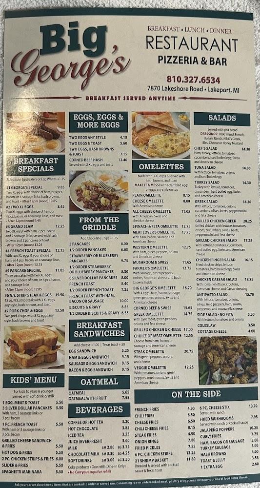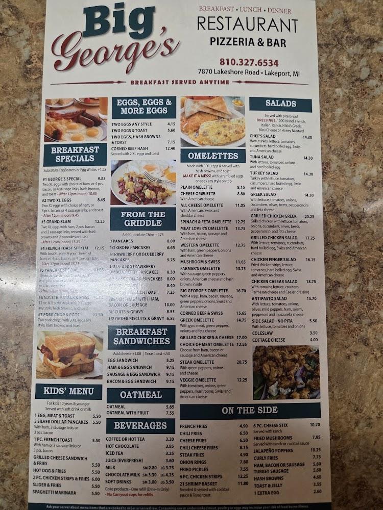 Big George's menu is diverse, catering to various tastes. Breakfast offerings include classics like pancakes, eggs, and unique omelettes, with the Meat Lover's Omelette being a favorite among patrons. The lunch and dinner menu features a delightful range, such as Coney Island hot dogs, juicy burgers, and hearty salads. For those craving something light, try the Greek Salad or Tuna Salad. Additionally, the menu includes delicious stir fry options and classic dishes like fish and chips or steak dinners. Portions are generous, ensuring satisfaction with every meal. Desserts also capture attention, offering sweet treats to round off the dining experience. Overall, the menu reflects a blend of traditional American diner fare with a unique twist, all prepared with care.